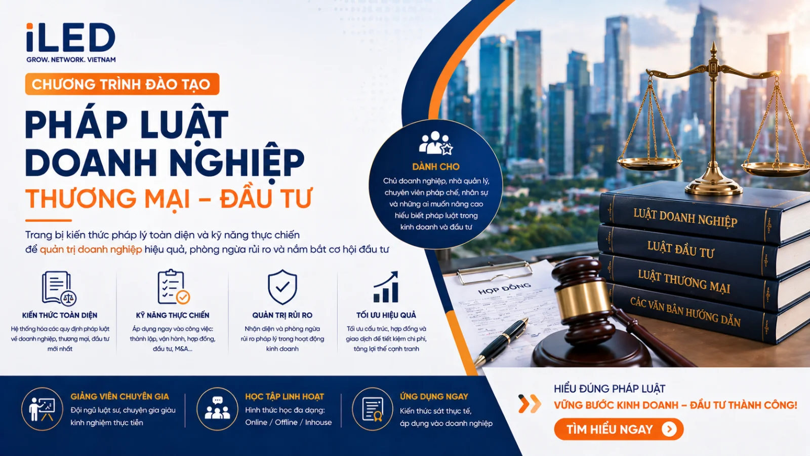 Khoá đào tạo 4 ngày (08 buổi) cuối tuần do Viện ILED tổ chức cho cán bộ pháp chế, kinh doanh, thương mại của doanh nghiệp và nhà đầu tư đang xây dựng/triển khai kế hoạch khởi nghiệp. Cập nhật pháp luật về Đầu tư, Doanh nghiệp và Thương mại theo Luật Đầu tư 2020, Luật Doanh nghiệp 2020 và Luật Thương mại — bám sát thực tiễn áp dụng.